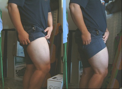 Here is a nice example of an athlete with massive, yet quad dominant thighs, working on his lower body balance. The first 2 pics were taken 6 months ago on the same day. The last one was after several months of more speed specific training focus. Notice how the quadriceps dwarf everything else in the first 2 pics and in the final pic everything is more even. Even at 5'10 and 215+ lbs this athlete can fly around with the best of them.